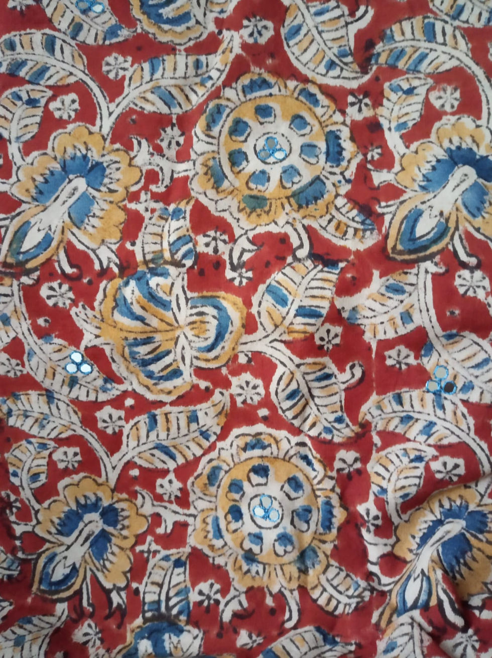 Kalamkari Hand-Block Print Fabrics are made by professional and experienced artisans from our hub and so all our designs exhibit masterclass perfection and accurate patterns. Also, the color combinations, mixing of colors shades, boiling correctly in order to get right shade is all matter of experience and can't be achieved overnight. The common fabrics used are 130 gms cotton cambric fabric for heavier option and a 70 gms cotton cambric fabric for lighter option. Both fabrics possesses best strength and undergoes stringent quality checks both internally and in the laboratory. All the designs used are own own creativity and posses high print perfection as well as color vibrancy.